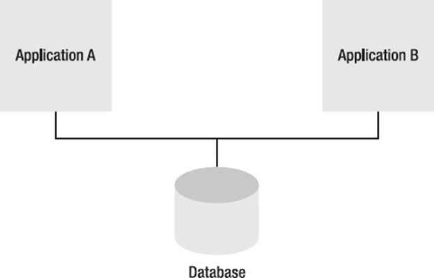 Utilizing the same data source or shared database is the best way to share data (see Figure 1–3). It's as easy to integrate two systems as it is to link two tables. However, employing a shared database for integration leads to a number of problems. First, it is challenging to develop an uniform schema that would satisfy the requirements of the many applications. By using a shared schema, it is possible to establish interdependence between two systems that could have various needs and timetables. Because of locking conflicts and network slowness when distributing across different sites, using a single dataset restricts the possibility for scaling. Shared databases connect all participating systems to a well-known schema (the database table), though the various systems are temporally decoupled; as long as the database is accessible, one system does not need to be available for another system to communicate a change. Systems in a shared database are conceptually separated from one another because only the shared database has to be aware of them.