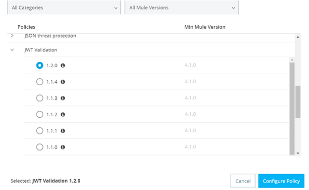 3. In Select Policy window, select the JWT Validation from the list and choose the latest version. Now, click on the “Configure Policy” button.