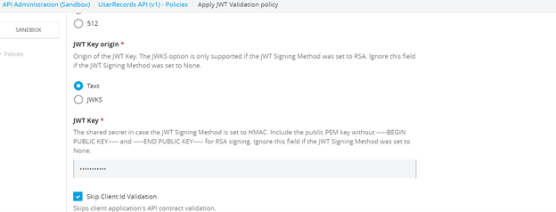 To apply JWT Policy on an API using Text option (i.e. without JWKS) through API Manager. This implies that JWT token is not to be generated by third party. By applying this policy, only authorized clients with valid JWT token can access the API.